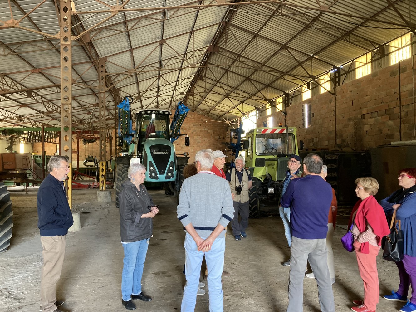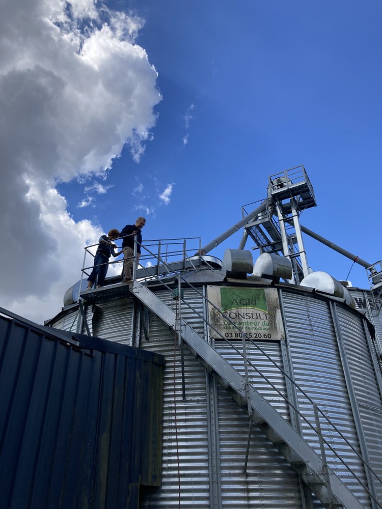 - Le matin, rendez-vous à la ferme des Plumassières, à Saint-Rémy-sur-Creuse. Accueillis par Franck Chicot, nous découvrons cette exploitation conventionnelle, une ferme céréalière de 600 ha : grosse installation de stockage de céréales, un parc de matériel agricole, un important équipement photovoltaïque, des cultures en terre, etc.
